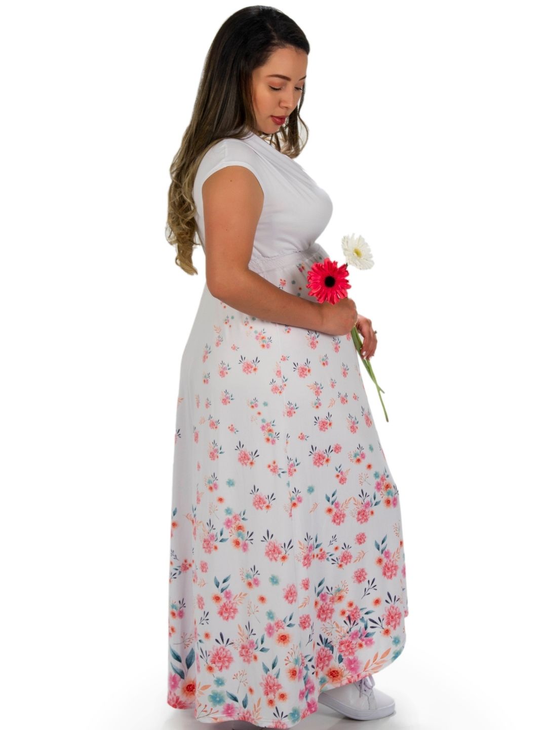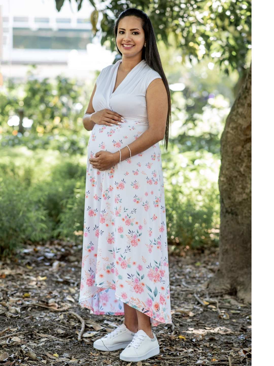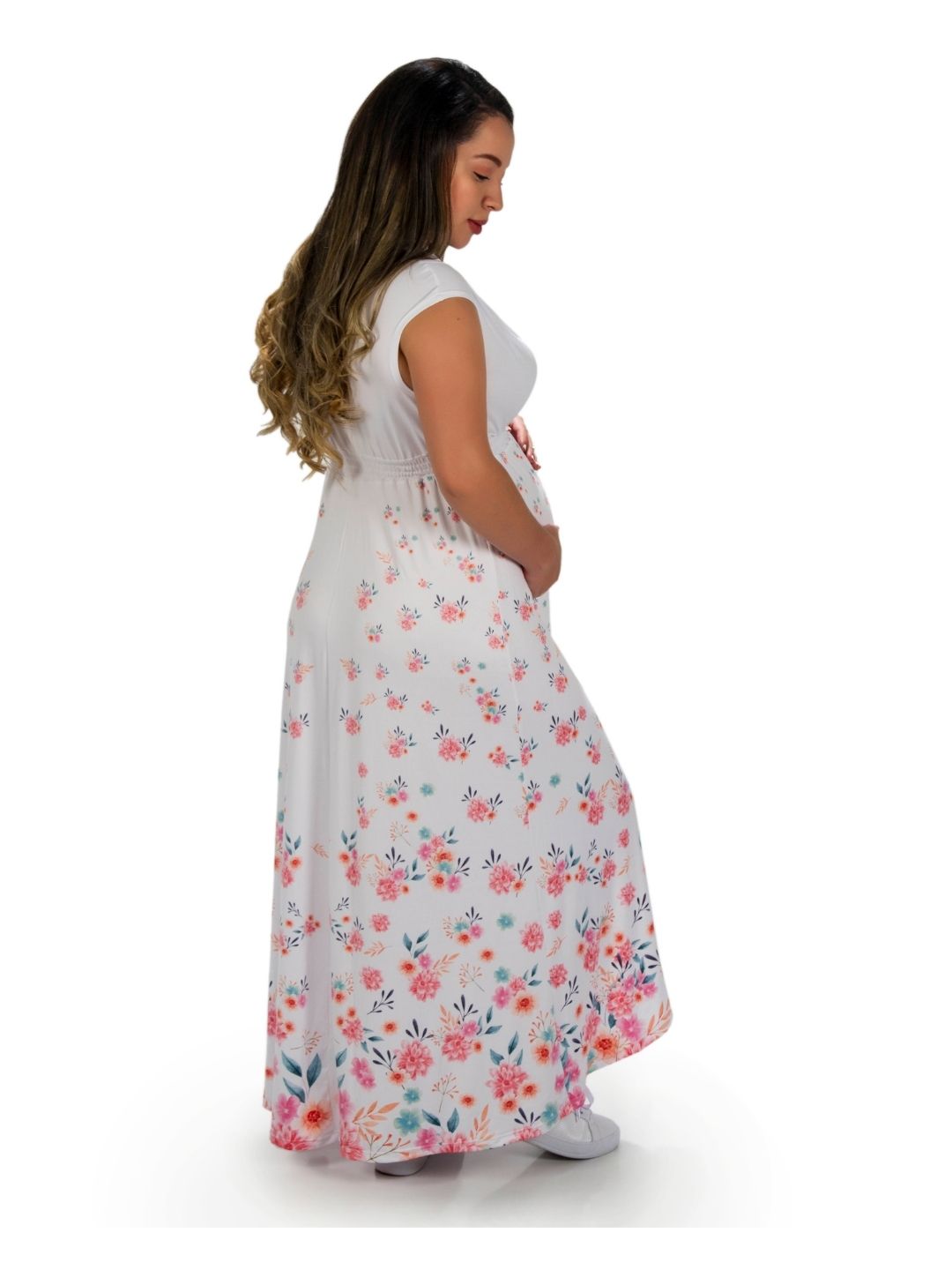 Gracias a su diseño largo y fluido con estampado floral, este vestido no solo aporta estilo y elegancia, sino que también facilita la lactancia gracias a su práctico cuello en V, convirtiéndose en una prenda funcional para cada momento de tu maternidad.